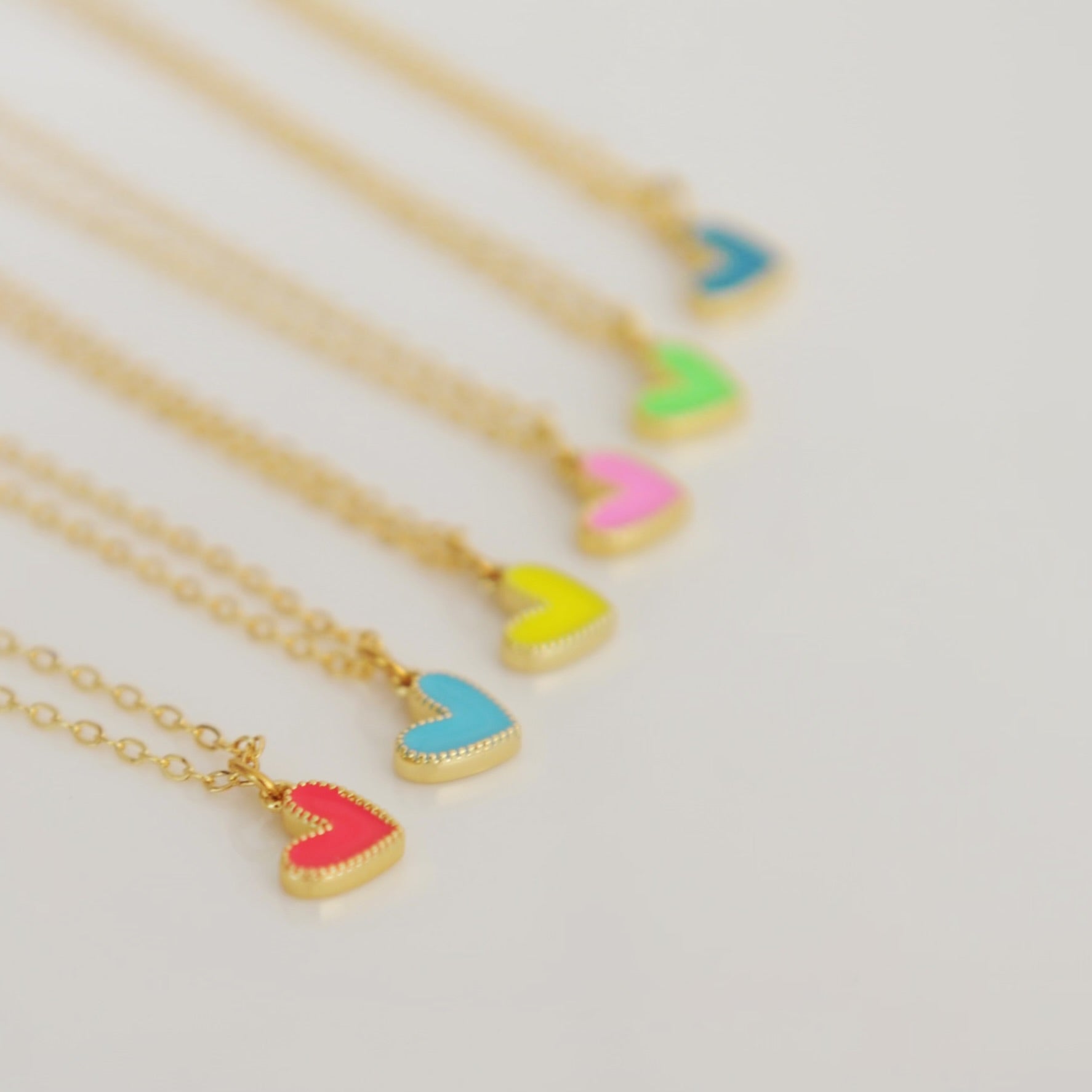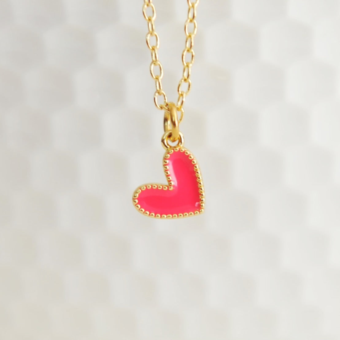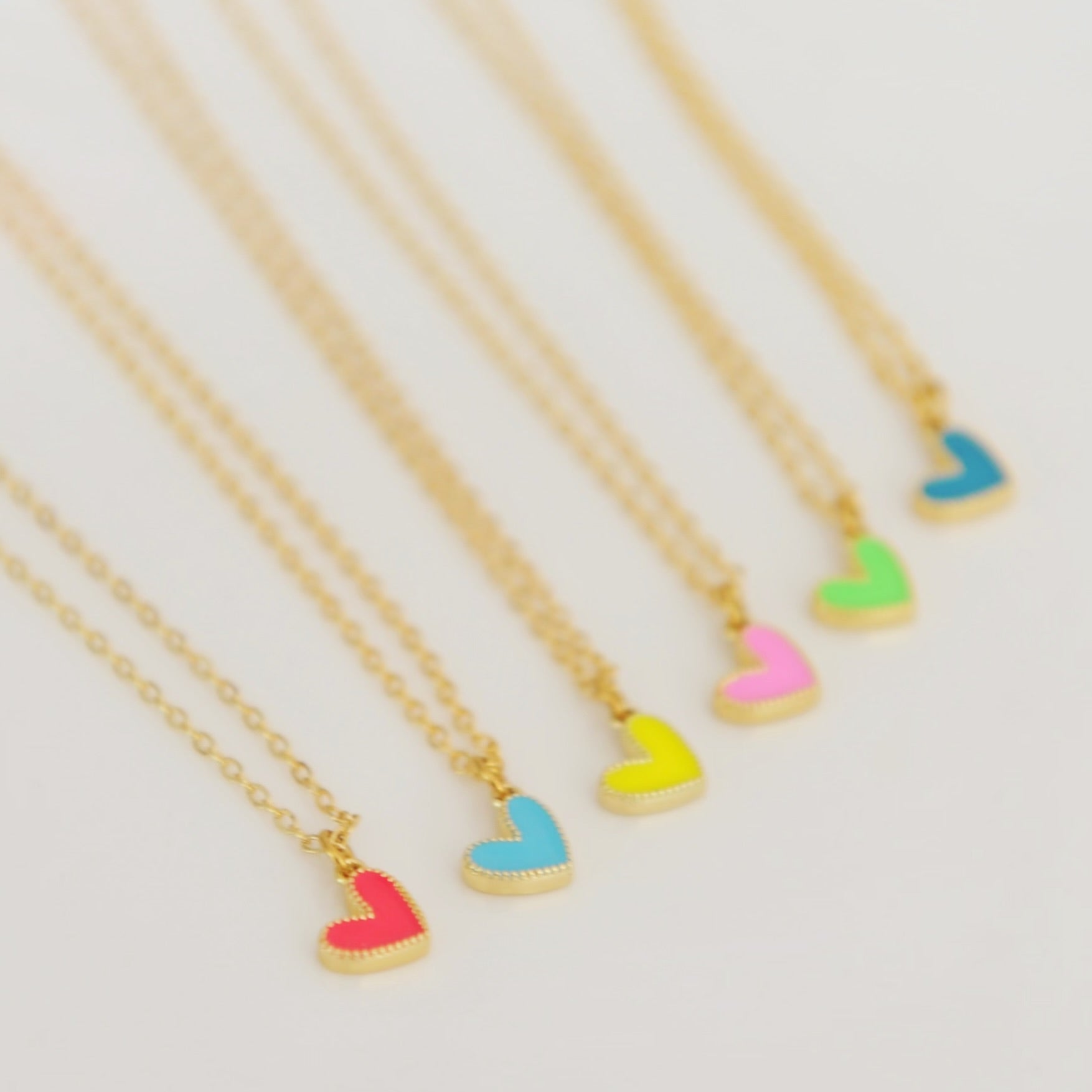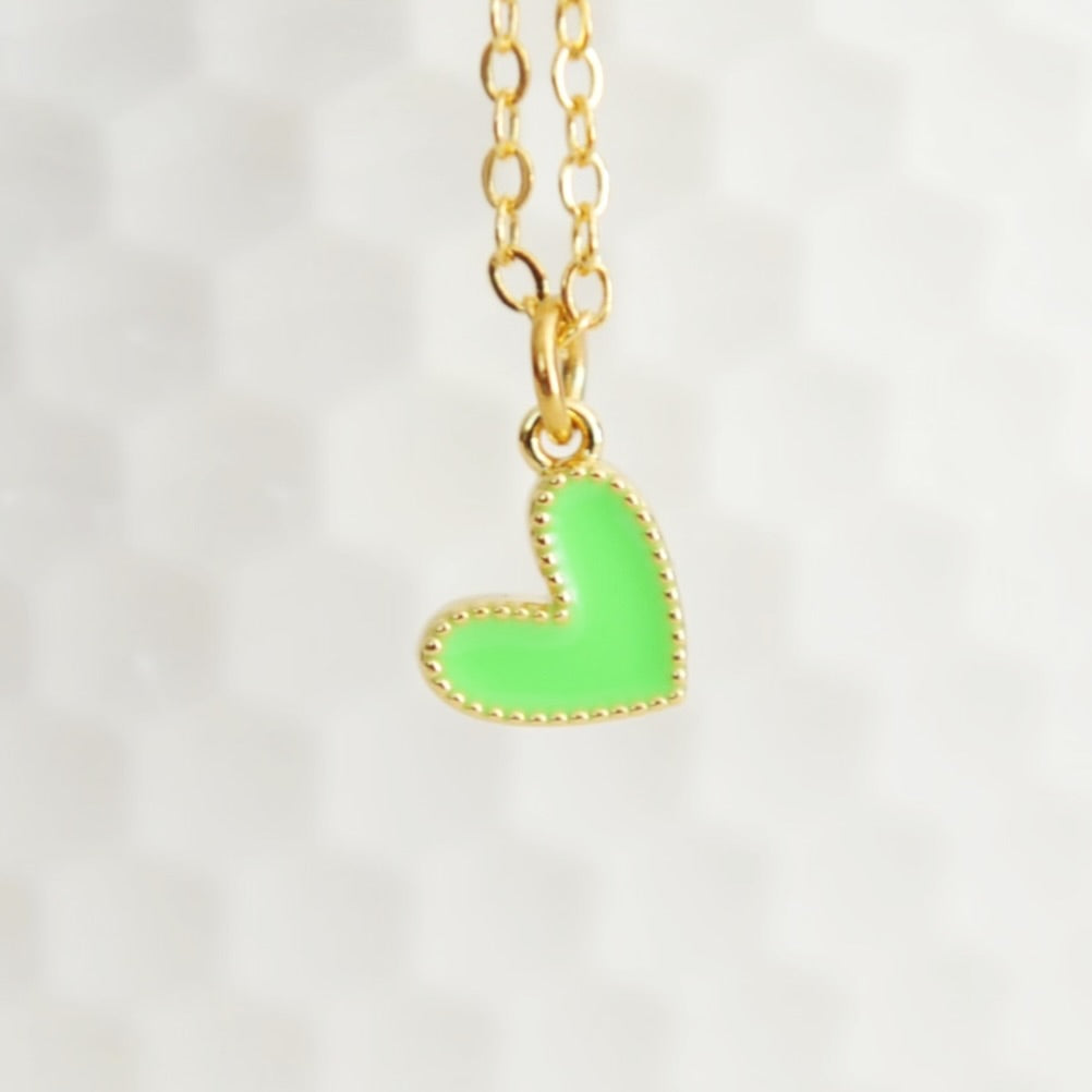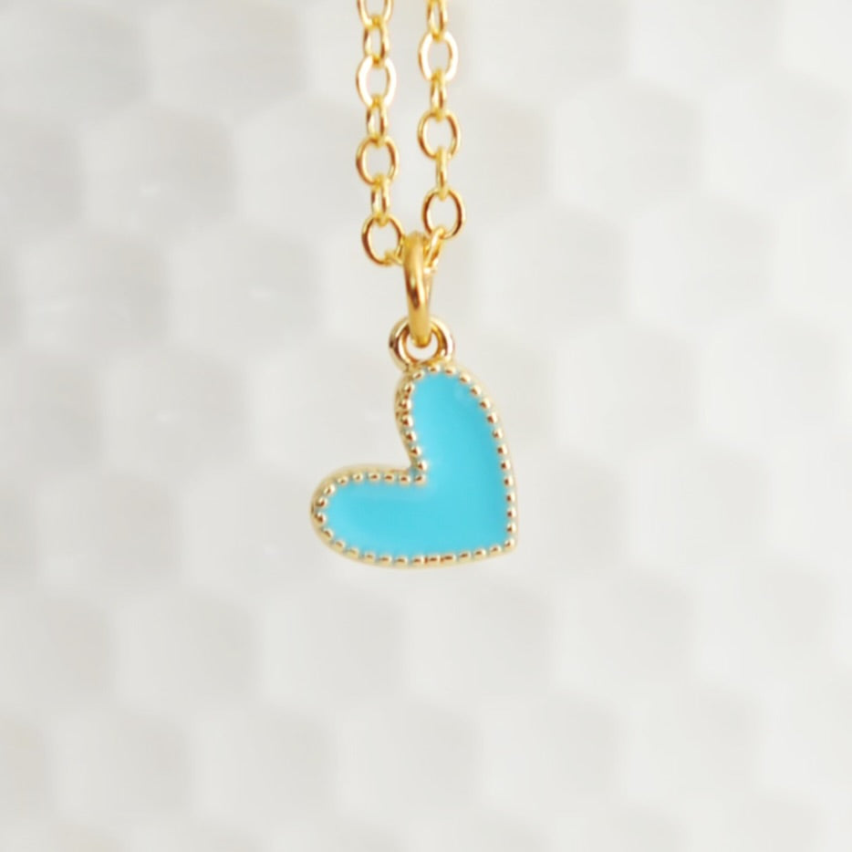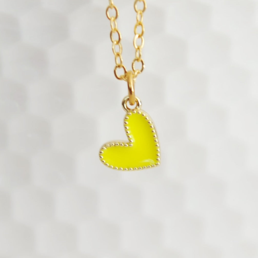 Our Amari heart necklace features a vibrant tiny gold filled colourful enamel heart upon an 18” 16 karat gold plated brass chain.