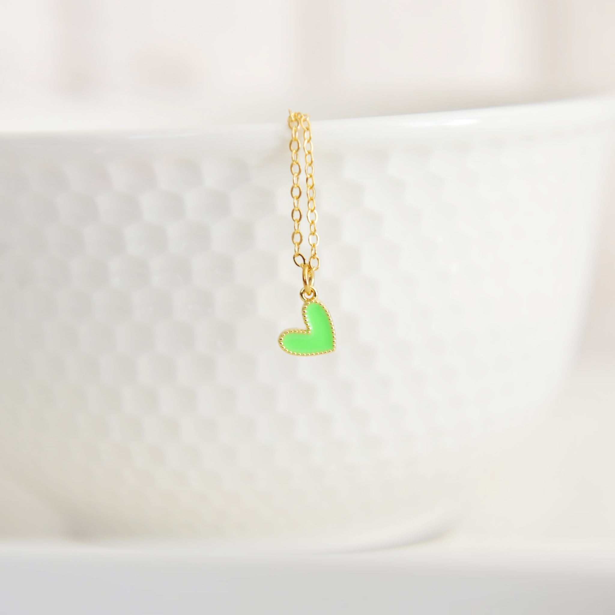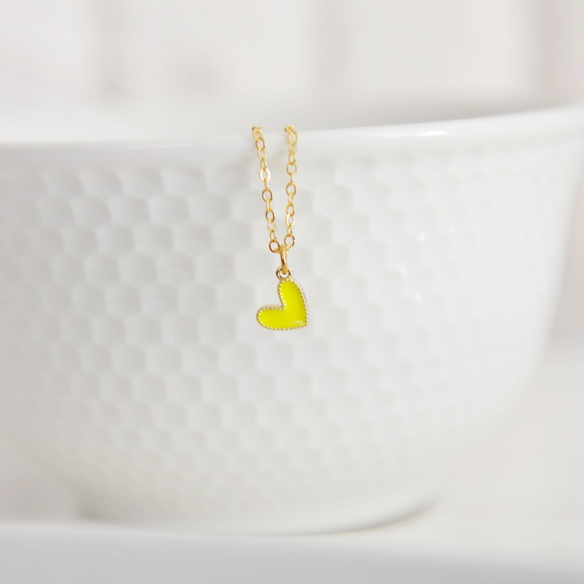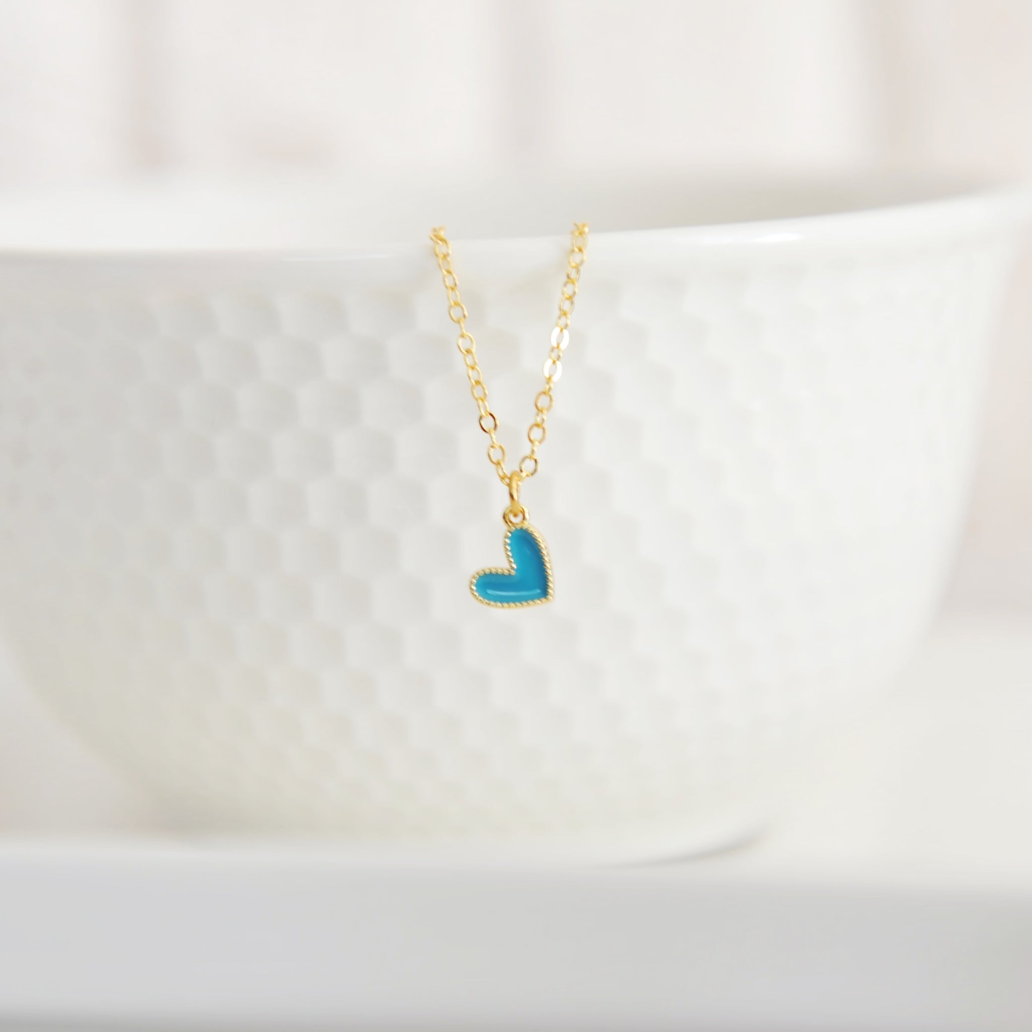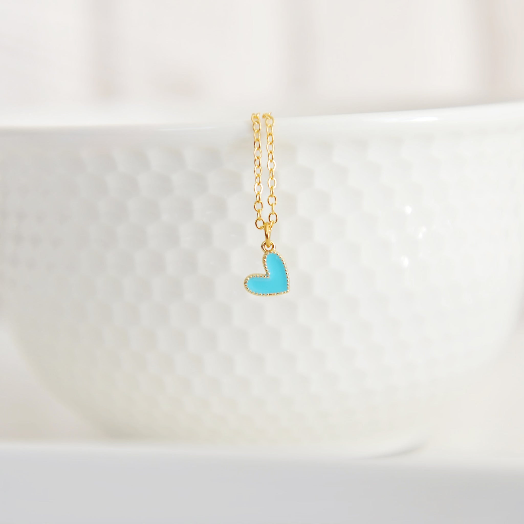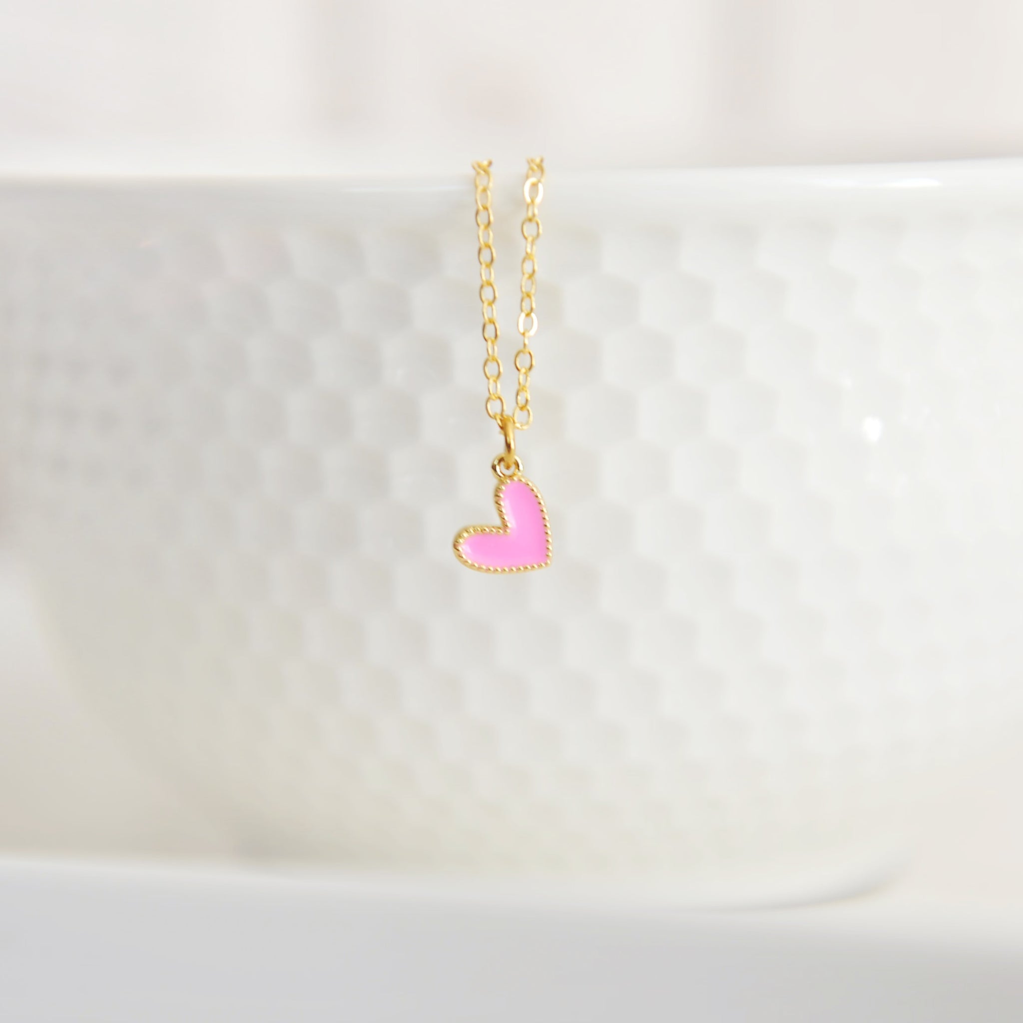 Our Amari heart necklace features a vibrant tiny gold filled colourful enamel heart upon an 18” 16 karat gold plated brass chain.